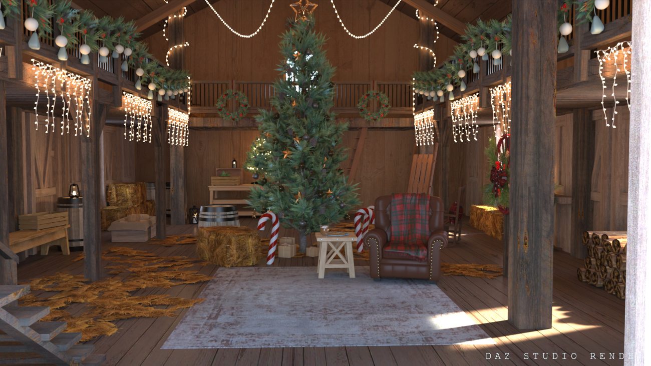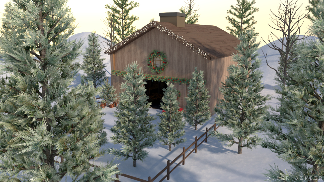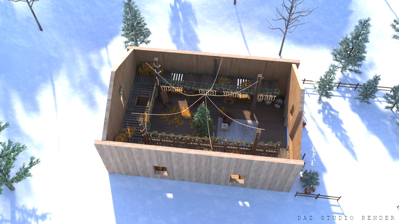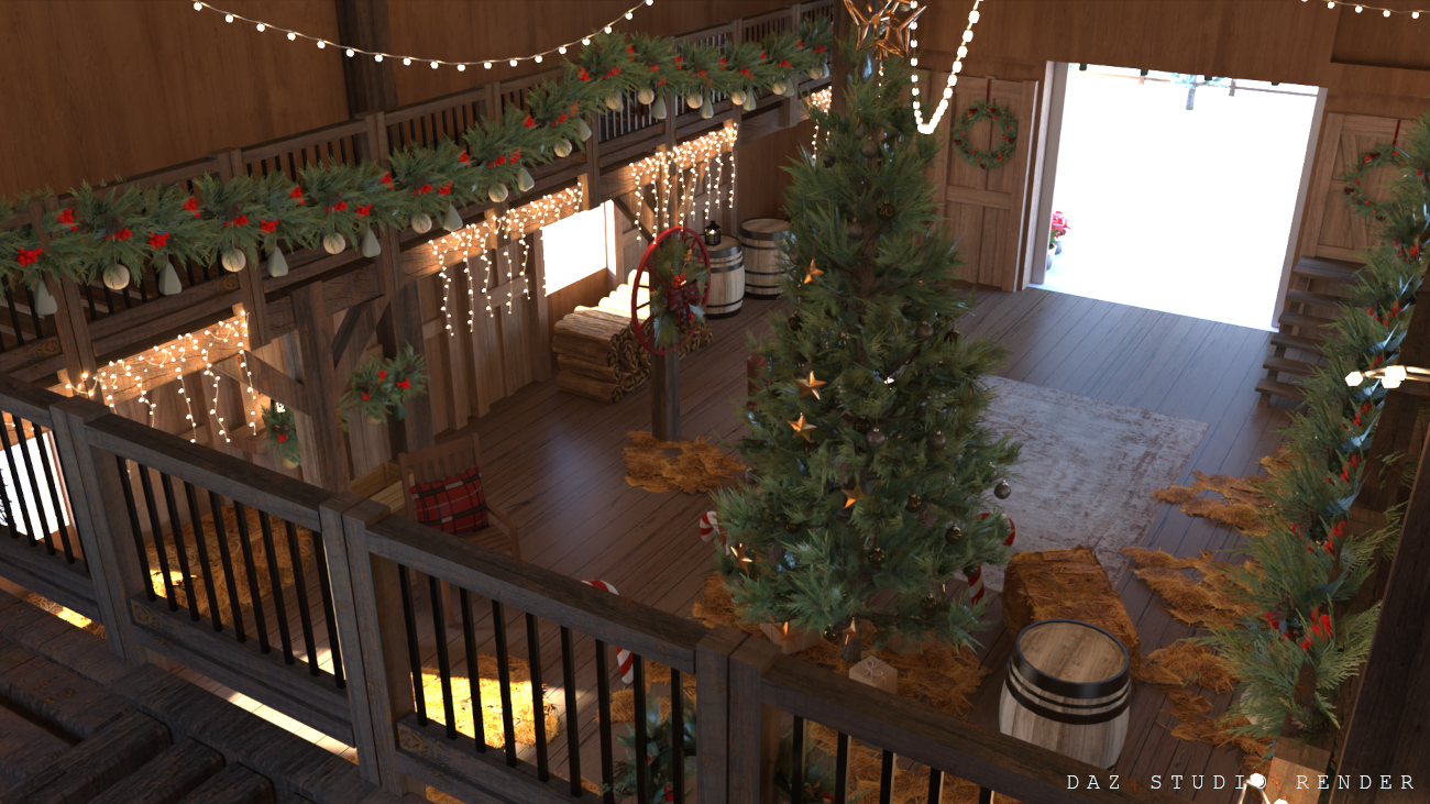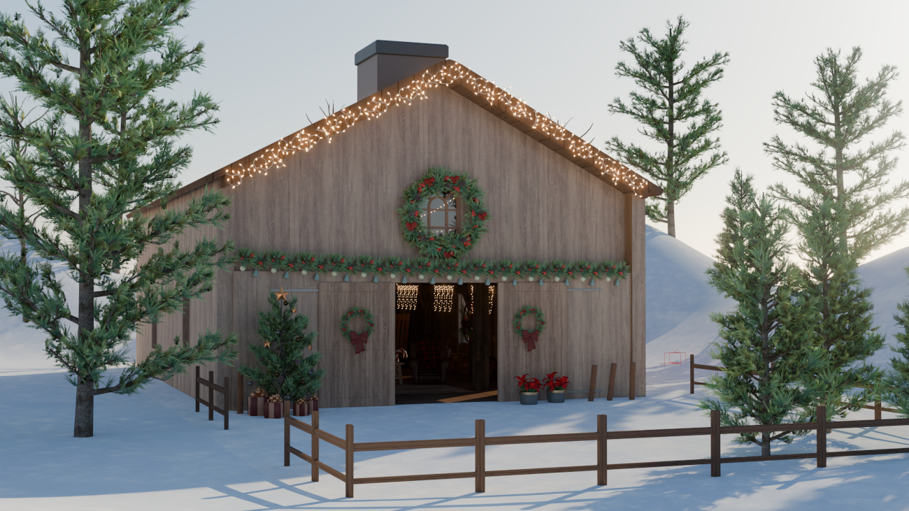 Christmas can be celebrated anywhere, even in a barn! This cozy little scene is placed in a snowy forest and features an interior with standard storage props as well as Christmas decor scattered about. There’s a basic second level to offer better views to the lower area, or to store more items!