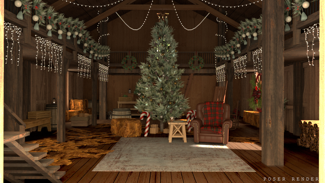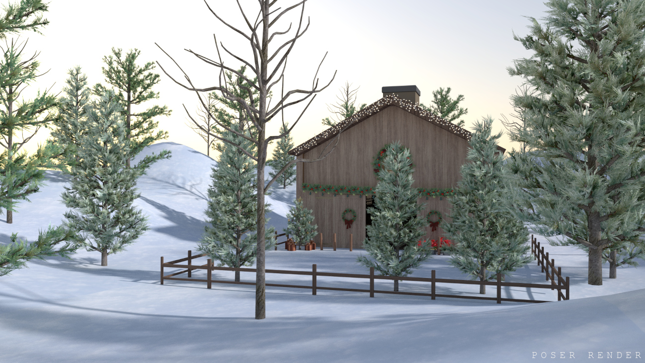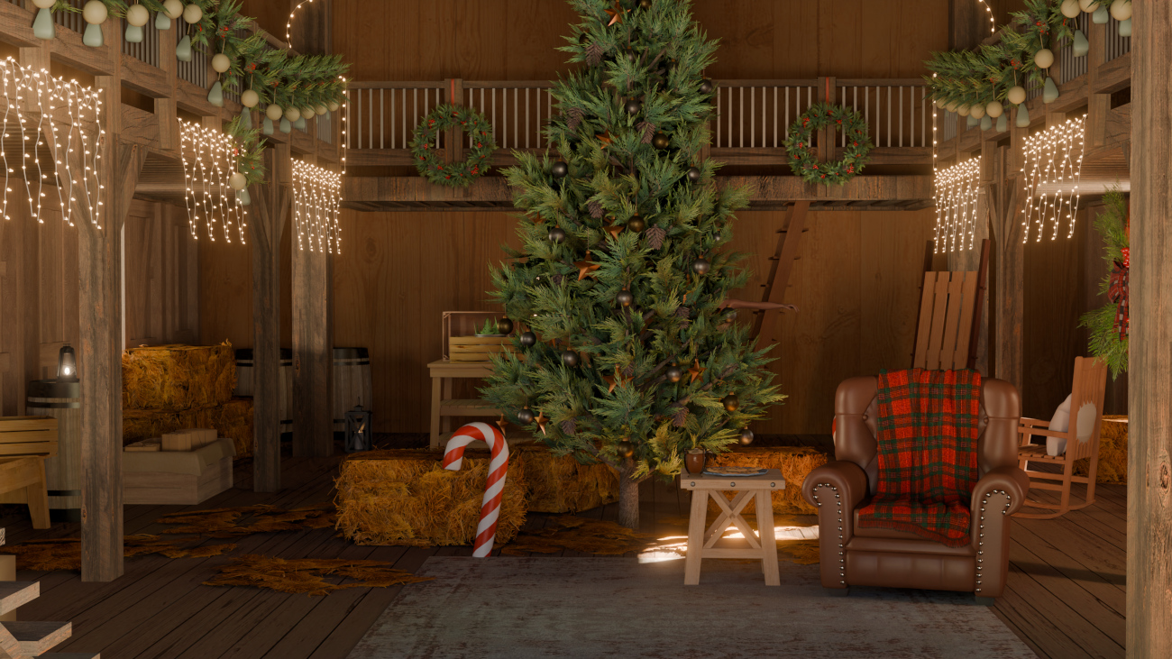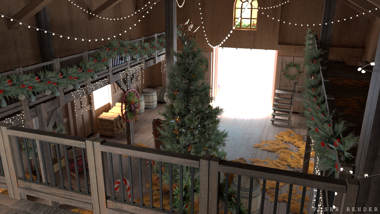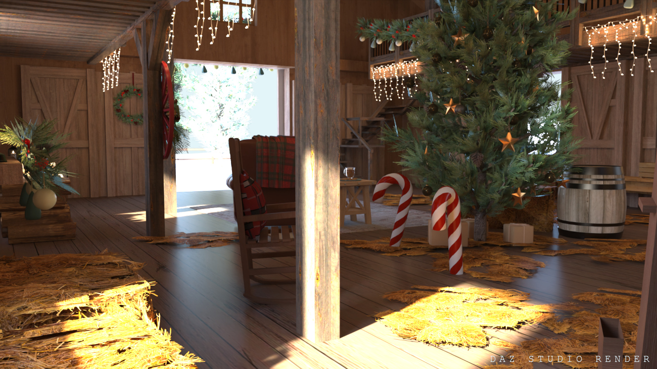 Christmas can be celebrated anywhere, even in a barn! This cozy little scene is placed in a snowy forest and features an interior with standard storage props as well as Christmas decor scattered about. There’s a basic second level to offer better views to the lower area, or to store more items!